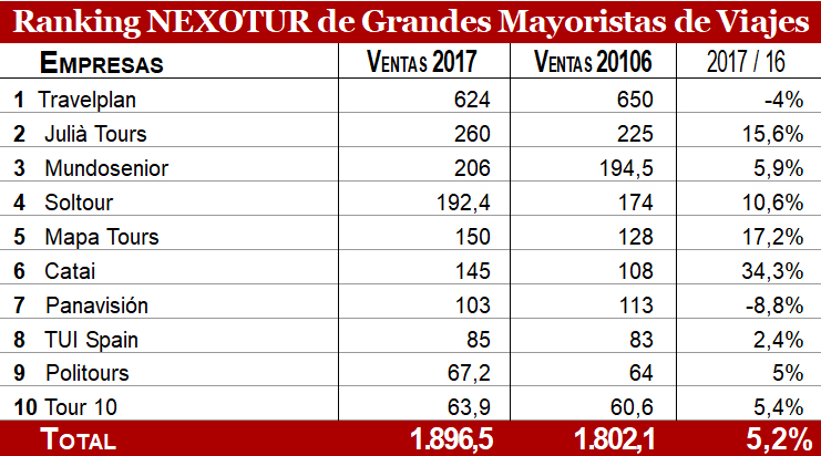 La división mayorista de Globalia, liderada por Travelplan, repite por quinto año en primera posición, puesto al que accedió en 2013 tras la desaparición de Orizonia. Encabeza el ‘Ranking NEXOTUR de Mayoristas de Viajes’ con un volumen de negocio de 624 millones de euros, lo que supone un retroceso del 4% en comparación con los 650 millones que alcanzó en 2016. Pese a esta bajada, el presidente de Globalia, Juan José Hidalgo, hace hincapié en la memoria anual del grupo en que «Travelplan se consolida como el touroperador más grande de España, líder en el mercado emisor español tanto en número de destinos como pasajeros». Según revela, «su producto estrella durante 2017, con un crecimiento del 15%, han sido los circuitos por Europa en los que aúna, al igual que en el resto de sus servicios, calidad y experiencia».