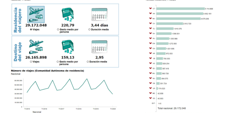 En este sentido, el INE ha analizado los datos por meses y por semanas para observar mejor el impacto de la crisis del Covid-19 en los viajes de los españoles. Así, por meses, el descenso ha sido del 7,3% en enero, del 10,5% en febrero y del 69,6% en marzo, mes en el que se decretó el estado de alarma. Si se observa el número de viajes por semanas, el descenso es generalizado en todas las semanas del trimestre, pero se acentúa a partir de la primera semana del tercer mes de 2020. En la segunda quincena de marzo se reducen casi un 96%, con 370.000 viajes, frente a los 8,5 millones del mismo periodo del año anterior. Asimismo, el gasto se desplomó un 92,1%.