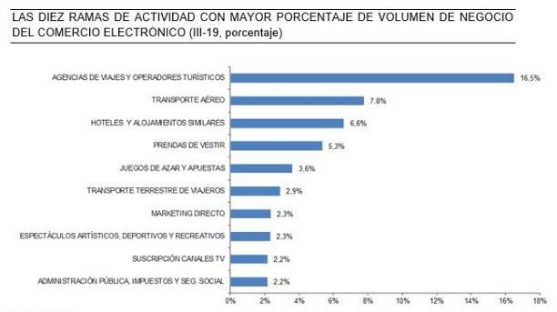 Por otra parte, las ramas de actividad que disponen de un mayor volumen de negocio desde España hacia el exterior son el transporte aéreo (un 9,9%), los hoteles y alojamientos similares (8,6%) y las prendas de vestir (un 6,7%). En este sentido, las áreas de actividad relacionadas con el Sector Turístico acaparan el 66,9% de las compras que desde el extranjero se hacen en webs de comercio electrónico españolas.