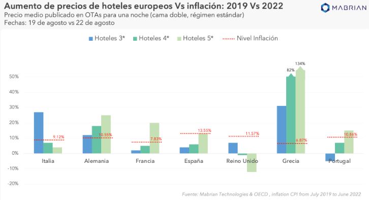 –Grecia, experimenta una subida más significativa de los precios de los hoteles, con un 134% en comparación con 2019, la tasa de inflación que se observa es de 6,87%. Esta subida tan elevada puede haberse dado con la reciente apertura de establecimientos de lujo en el país, los que ha incrementado el valor medio de los alojamientos en el país. Los hoteles griegos de tres y cuatro estrellas mantienen una subida del 31% y un 82% respecto a 2019.