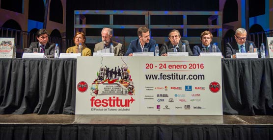 Los datos del estudio Preferencias y hábitos de ocio de los profesionales del turismo en Fitur se publicaron ayer, en la presentación de la segunda edición de Festitur a la que asistieron el presidente de Noche Madrid, Pedro Serrano; el director general de Ifema, Fermín Lucas; la directora de Fitur, Ana Larrañaga y el director de atención e información turística de Madrid Destino, Iván González, entre otros.