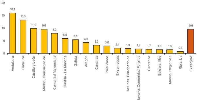 Respecto a los destinos de origen de los viajeros,desde la Comunidad de Madrid han salido 35.343.853 de usuarios, abarcando el 18,2% del total en el pasado año. Por detrás se sitúan Cataluña, con 33,4 millones (17,3%) y Andalucía con 29,7 (15,3%). Por otro lado, las principales Comunidades de destino de los viajes de los residentes en el 2019 han sido Andalucía (16,9% del total), Cataluña (13%) y la Comunidad valenciana (10,2%). En cambio, los destinos visitados en menor medida fueron La Rioja (0,8% del total), Comunidad Foral de Navarra (1,5%) y las islas Baleares (1,7%).