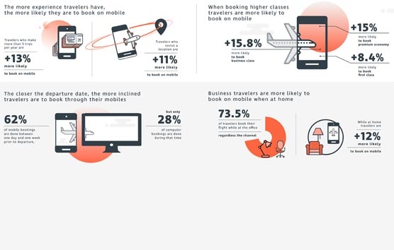 Los viajeros que hacen más de cinco viajes al año tienen un 13% más de probabilidades de reservar a través del móvil, según el estudio, mientras que los que visitan de nuevo un destino, un 11% más. Además, el informe destaca que el 73,5 % de los viajeros reserva sus vuelos en la oficina, independientemente del canal, sin embargo, si reservan sus vuelos en casa, tienen un 12% más de probabilidades de reservar a través del móvil.