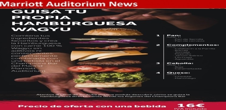 La IV edición de Madrid Hotel Week ha dado su pistoletazo de salida a una semana completa de actividades de todo tipo: historia, arte, familia, música, coctelería, deporte o gastronomía. Y hablando de estos últimos Madrid Marriott Auditorium volverá a estar presente combinando ocio y oferta culinaria de altura en uno de los espacios más especiales del hotel: el Champions Bar. En su amplia gana de Hamburguesas, destaca la Wagyu, una de las carnes más selectas del mundo y que durante esta semana podrás elaborar tu mismo combinando tus ingredientes favoritos. Este año, más que nunca, no nos lo podemos perder.