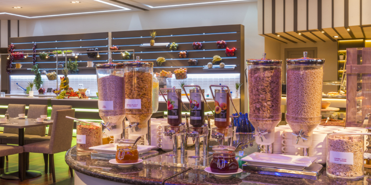 El espacio de restauración del hotel, ofrece un amplio abanico gastronómico en un mirador a la capital. Ha sido redecorado con murales fotográficos que permiten contemplar La Puerta de Alcalá y otros lugares de la ciudad. Ofrece la posibilidad de elegir desde comida saludable a suculentos manjares. Comida nacional en el restaurante Karma, comida americana en el Champions Bar, desayunos y snacks exclusivos para ejecutivos en el Executive Lounge y muchas otras opciones se encuentran disponibles para los clientes del Madrid Marriott Auditorium.
