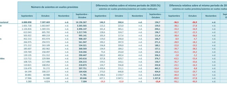 Los mercados que presentan una mejor evolución son Dinamarca y Países Bajos, con un volumen de asientos programados hacia España en los meses de septiembre y octubre que alcanza el 96% (290.447 plazas) y el 93,2% (908.187 asientos) de la capacidad aérea del mismo periodo de 2019, respectivamente. Por su perte, desde Reino Unido se prevé operar entre septiembre y octubre más de 3,2 millones de asientos (el 66,7% de lo que se operó en los mismos meses de 2019); desde Alemania 2,5 millones de asientos (el 75% de 2019), desde Italia 1,2 millones de plazas (el 72%) y desde Francia más de 995.000 asientos (el 62% de lo operado en los mismos meses de 2019).