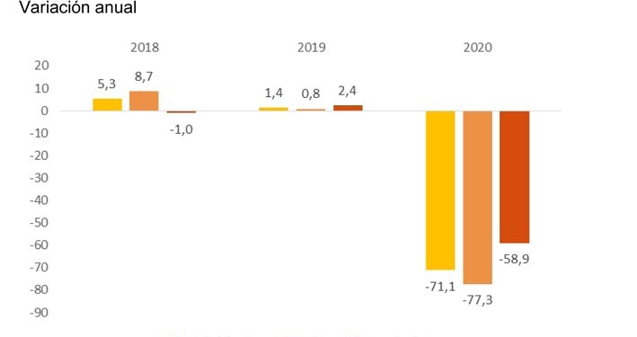 El desembolso total realizado por los turistas no residentes en España descendió un 78% en 2020