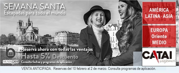 La cuña arranca con un eslogan muy claro: «Mundigea y Catai ponen el mundo a tu alcance», así de fácil. Ambas marcas podrían tener este lema todo el año, pero con las posibilidades de la venta anticipada de Semana Santa, la idea toma más fuerza. Una selección de destinos por el Rin, Países Bajos o Jordania con un ahorro del 8% si la reserva se efectúa antes del 10 de marzo es muy atractivo para el cliente.