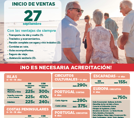 El próximo viernes 27 de septiembre (a partir de las 9.00 horas), pondrá a la venta las plazas de su denominado Programa de Turismo Social. Lo hará con aproximadamente una semana de antelación respecto a los viajes del Imserso, cuya distribución, según anunció el Ministerio de Sanidad, Consumo y Bienestar Social, empezará a finales de la semana que viene o principios de la siguiente.