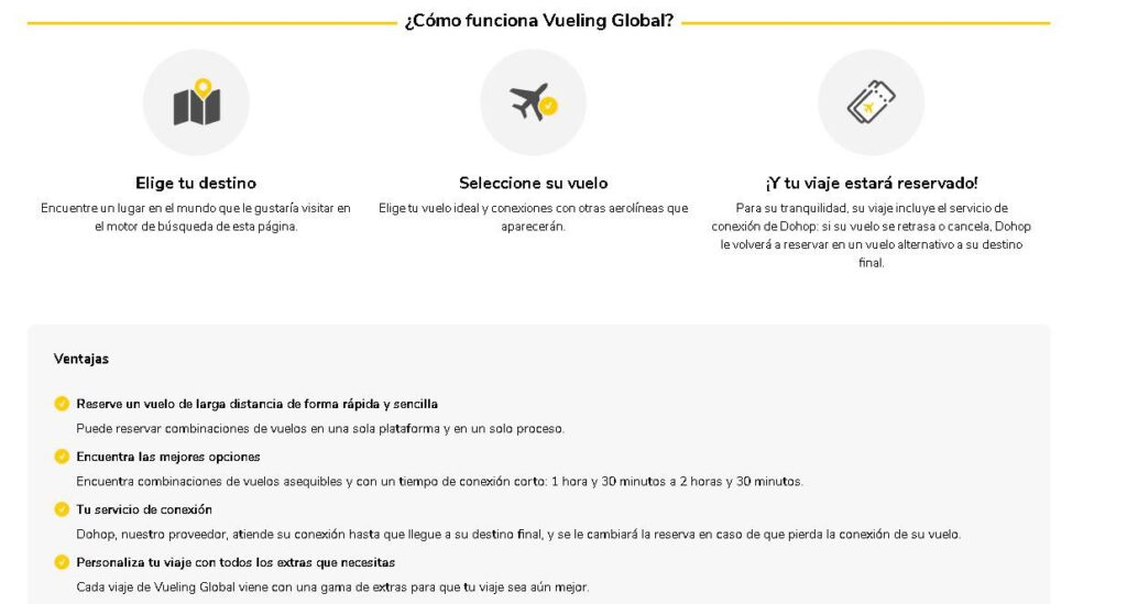 Gracias a este nuevo servicio, impulsado por el proveedor de tecnología Dohop, los clientes de Vueling y de Level podrán efectuar reservas en conexión desde y a destinos ofrecidos por ambas compañías en una misma plataforma. De esta manera, los clientes que quieran adquirir un billete desde Sevilla hasta San Francisco o desde Bilbao a Buenos Aires podrán hacerlo con una única reserva gestionada a través de la plataforma Vueling Global. Vueling, así, espera impulsar sus conexiones con vuelos de larga distancia desde el aeropuerto de Barcelona-El Prat. En este sentido, la aerolínea tiene la intención de incorporar próximamente nuevas aerolíneas a la plataforma.