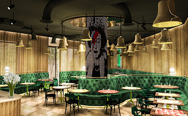 El restaurante The Bell será una versión vanguardista del típico pub británico, con una sala rodeada de asientos tapizados en cuero verde y mesas que mostrarán rimas cockney, el popular dialecto londinense. La delicada iluminación de este espacio provendrá de unas campanas doradas, en recuerdo de las famosas campanas de iglesia de la ciudad. En contraste, la columna central mostrará una pantalla LED pixelada que generará imágenes en constante movimiento.