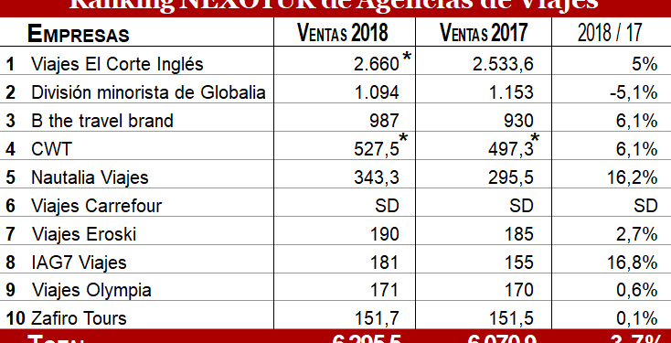 Aunque por política de empresa el grupo Carrefour no desglosa su cifra de negocio por divisiones, según fuentes consultadas por este periódico, su posición en el Ranking NEXOTUR de Agencias de Viajes sería la sexta. Así aparece reflejado en la tabla. Viajes Eroski concluye 2018 con un volumen de negocio de 190 millones, un 2,7% más que en 2017. Le sigue IAG7 Viajes, que escala una posición gracias al espectacular avance del 16,8% que ha cosechado, pasando de facturar 155 millones a 181 millones. La novena posición es para Viajes Olympia con 171 millones, un 0,6% más. Zafiro Tours completa el ranking con 151,7 millones, un 0,1% más que en el año anterior.