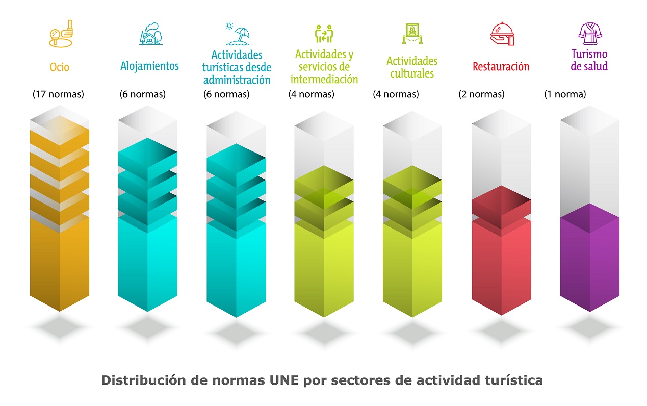 Estos estándares se elaboran en los comités técnicos de normalización (CTN) de UNE, y son fruto del consenso de todas las partes implicadas. Bajo el impulso del Instituto para la Calidad Turística Española (ICTE), que gestiona desde hace 15 años la secretaría de una decena de CTN, se han desarrollado normas clave en materia de calidad turística, como la UNE 182001 para hoteles o la UNE 302002 de museos, detalla el informe. Además, muchas han constituido la base para elaborar estándares internacionales, como la Norma UNE-ISO 13009 sobre playas, exportando de este modo la experiencia y conocimiento españoles en todo el mundo.