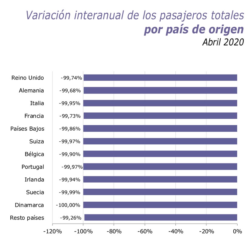 Por otro lado todos las principales regiones emisoras de pasajeros internacionales decrecieron con descensos similares y superiores al 99%. Sin embargo, esto no ha provocado que Reino Unido continúe siendo el principal país exportador de turistas a España. El 51,3% de los pasajeros internacionales procedieron de Reino Unido, Alemania y Francia. Si se observa únicamente el tráfico de las compañías low cost, estos tres países suman el 86,8% de los pasajeros que llegaron con este tipo de aerolíneas. Asimismo, en todas las Comunidades autónomas se registraron descensos superiores al 99% en el número de turistas internacionales que llegaron en abril.