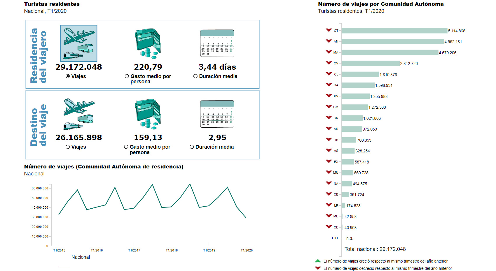 Las principales Comunidades autónomas de destino de los residentes en el primer trimestre de 2020 son Andalucía (17,2% del total), Cataluña (12,9%) y Comunidad de Madrid (9,4%). Si se relacionan los viajes internos de los residentes con la población de destino, el fenómeno viajero tiene más intensidad en Castilla y León (con 1.055 viajes por cada 1.000 habitantes), Aragón (1.043) y La Rioja (902).