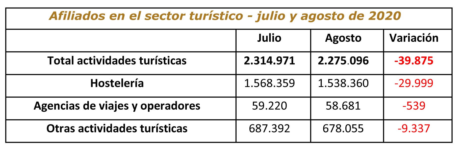El mes de agosto ha cerrado con un total de 2.275.096 trabajadores en alta laboral vinculados a actividades turísticas, cayendo un 1,8% (-39.875) respecto al pasado mes de julio, cuando el Sector ganó 100.099 afiliados nuevos, alcanzando los 2.314.971. Según el secretario de Estado de Turismo, Fernando Valdés, este ligero descenso se debe esencialmente «al impacto de las cuarentenas impuestas por algunos países a los viajeros procedentes de España». No obstante, el número de afiliados sigue abarcando el 12,2% del total de afiliados en la economía nacional, según los datos incluidos en el Informe sobre Empleo en Turismo elaborado por Turespaña.