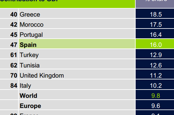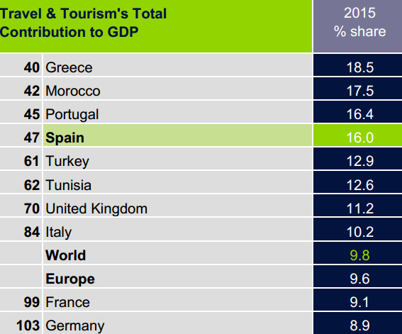 Atendiendo a los datos de 2015, España ocupa el cuadragésimo séptimo lugar en el ranking de países con mayor dependencia de la actividad. El Turismo es aún más clave para las economías de competidores como Grecia, Marruecos y Portugal, donde representa el 18,5%, 17,5% y 16,4% del PIB.