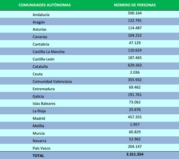 De las aproximadamente 3,3 millones de personas inscritas en el programa de Turismo del Imserso, casi la mitad residen en Cataluña, Andalucía y Madrid. La primera Comunidad autónoma está en cabeza con 629.263 solicitantes, seguida de Andalucía con 500.164. Madrid, por su parte, alcanza los 457.355. En el lado opuesto figuran La Rioja (25.676), Cantabria (47.129), Navarra (52.962), Murcia (60.829), Extremadura ( 69.462) y Baleares (73.062).