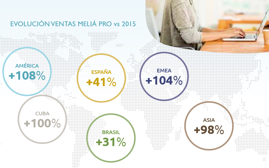 MeliáPro, plataforma B2B de Meliá Hotels International, tiene un peso creciente en la distribución del grupo hotelero. Según informa en su memoria, las ventas realizadas a través del ‘portal’ experimentan un aumento interanual del 71% en 2016.
