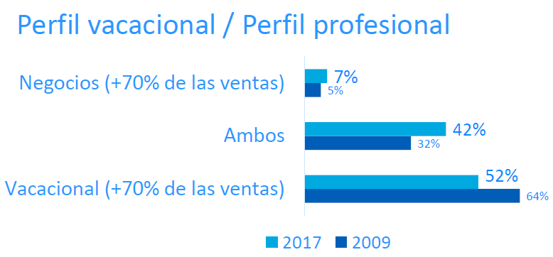 Según los datos recogidos en un informe de Amadeus y la Asociación Corporativa de Agencias de Viajes Especializadas (ACAVE), de las 4.500 agencias que operan en el mercado español, un 7% se declara de negocios (un 70% más de sus ventas corresponden a este segmento), mientras que un 42% reparte su actividad entre el corporate y el vacacional. En comparación con 2009, año en el que la crisis económica comenzó a afectar de lleno a la industria turística, las primeras representaban el 5%, mientras que el porcentaje de las segundas era únicamente del 32%, diez puntos por debajo del actual. A día de hoy, siempre según los datos del citado estudio, el producto vacacional representa el 60% de la facturación de las agencias de viajes.