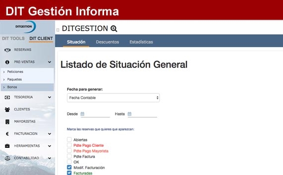 • Crear bonos personalizados con los datos ya añadidos en cada expediente de DITConta y todos los datos de la agencia añadidos de manera automática (datos fiscales, logos etc.)