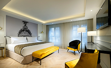 Además, el establecimiento, que cuenta con 84 habitaciones, se ha tematizado en torno a Madrid, con la inclusión de imágenes que muestran los espacios más emblemáticos de la ciudad y sus edificios históricos. Asimismo, la recepción del hotel da la bienvenida a sus visitantes con una fotografía de la reconocida Gran Vía; y en los cabezales de cada una de las estancias se pueden ver fotos del Palacio de Cristal, la Puerta de Alcalá, la Plaza Mayor, el Edificio Metrópolis o el Edificio Tomás Allende.