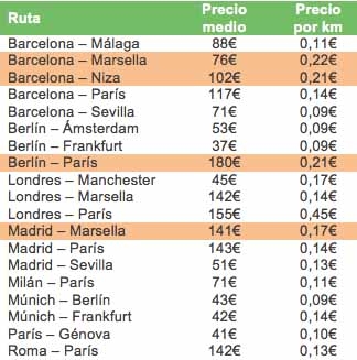 Estas tarifas resultan mucho más elevadas que otras rutas europeas como Milán-París, cuyo precio es de 71 euros (con un coste medio por kilómetro de 0,11) y París-Génova, con un precio de 41 euros (0,10 euros por kilómetro). Fuera de las rutas entre España y Francia solo existe un trayecto con precios superiores. Se trata de la conexión entre París y Londres, que cuesta de media 155 euros (0,45 euros por kilómetro).