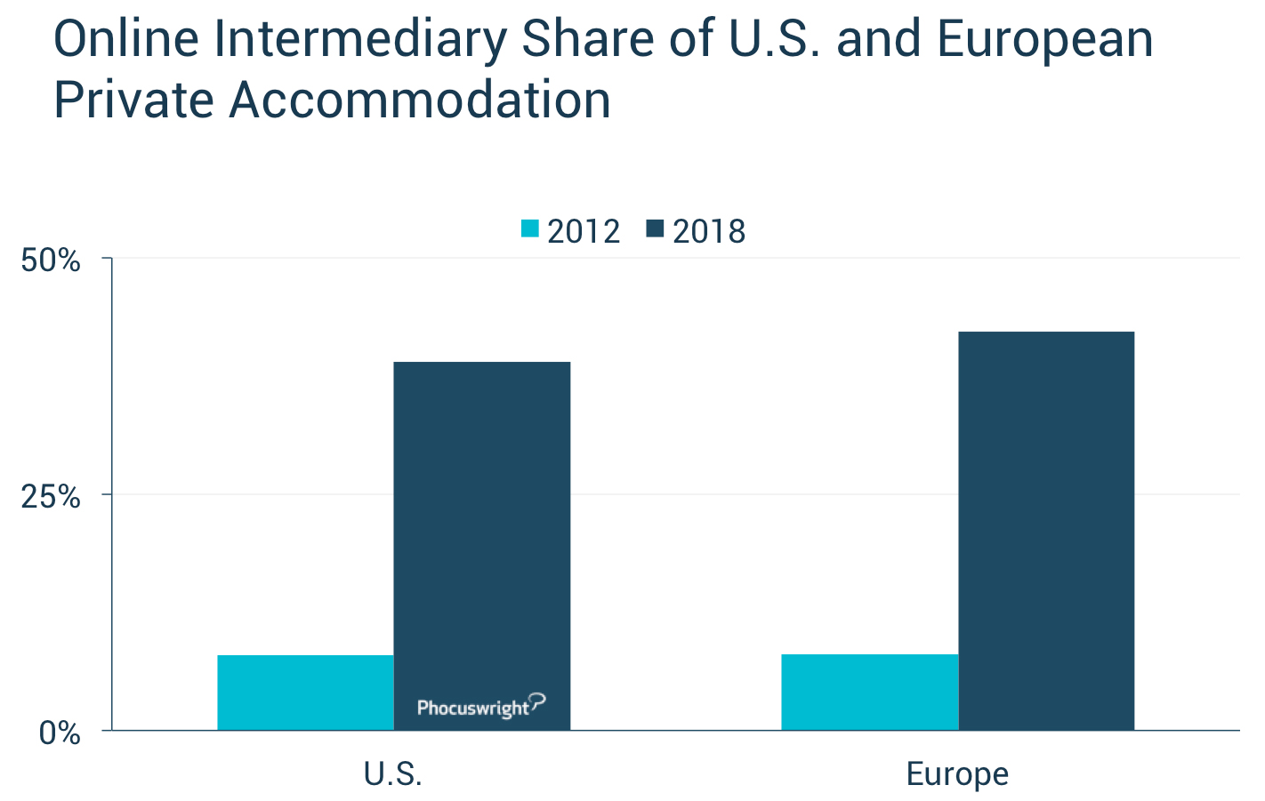 Según un informe de Phocuswright, los intermediarios que operan en la Red, especialmente las agencias de viajes online (OTAs) y ‘portales’ especializados en alquiler como Airbnb y HomeAway, están capacitados para «ejercer una influencia aún mayor en el alojamiento privado» en comparación con el hotelero. Su previsión es que en 2018 ya controlen el 40% del negocio en Europa y Estados Unidos, frente al 10% que representaban en el año 2012.