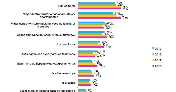 El estudio de Cetelem revela que cerca de la mitad de los españoles, en concreto un 45%, se hospedarán en hoteles o apartamentos en el territorio nacional, cuatro puntos porcentuales más que en 2017. En comparación con 2015, el porcentaje pasa del 37% al citad 45% actual.
