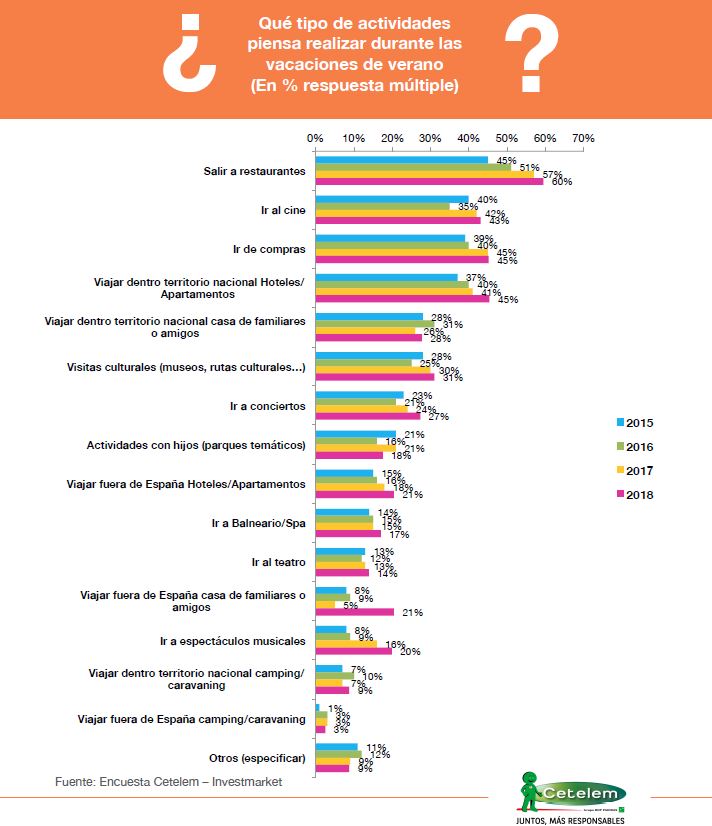 No obstante, la entidad financiera aclara que «es importante tener en cuenta que se trata de intenciones de gasto, y que éstas suelen ser más bajas que el desembolso que realmente se termina haciendo y que Cetelem recogerá en el barómetro del mes de septiembre». En esta línea, detalla que aunque la intención de gasto para este verano es algo inferior a la de 2017, está por encima de los niveles alcanzados tanto en 2015 como en 2016.