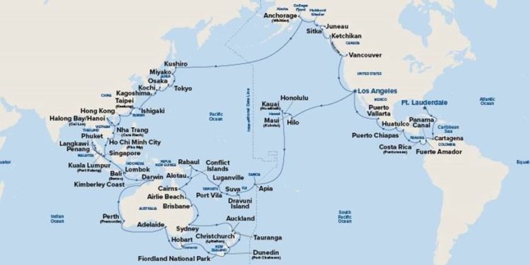 Con nueve pernoctaciones, incluye una noche en Hong Kong y escalas nocturnas en Anchorage (Whittier), Cairns, Honolulú, Osaka, Singapur, Suva, Sídney y Tokio, los pasajeros tendrán tiempo de sobra para explorar y empaparse de las culturas locales. A bordo, el viaje de 35.400 millas náuticas cruza dos veces el Ecuador y la Línea Internacional del Tiempo.