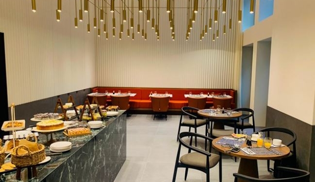 En el buffet se puede observar una gran luminaria creada a patir de la repetición de mini focos. Así como en las habitaciones observamos luminarias de sobremesa y de pie.