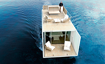 Con una superficie total de 74 metros cuadrados, el pabellón móvil está pensado para el disfrute de dos personas y se divide en dos plantas, cuyo diseño y equipación es minimalista. La primera de ellas, de 40 metros cuadrados de superficie, tiene un camarote con baño y una terraza privada, continua al espacio interior. Por su parte, la segunda planta es una cubierta chill-outque posee una zona diseñada para la relajación y el confort de los huéspedes. Precisamente uno de los puntos más innovadores de esta iniciativa es el control de la experiencia por parte del usuario, y es que, a través de una app, el huésped puede decidir sobre todos los aspectos domóticos de la habitación. Es decir, la iluminación, el sonido, la climatización o los aromas, entre otros.