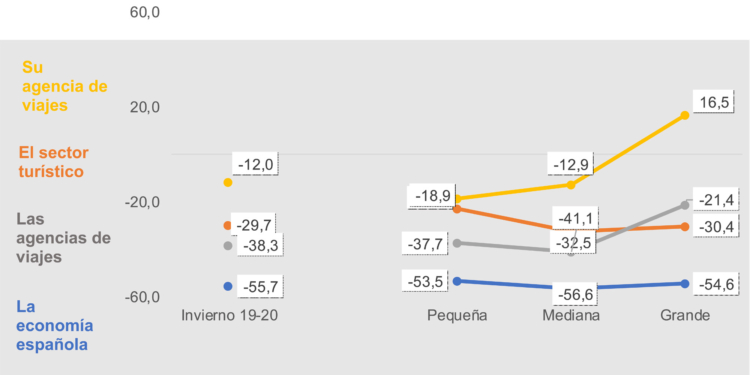 Un dato muy relevante que se desprende del estudio es la diferente percepción de las agencias de viajes españolas en función de su tamaño. Y es que solo las grandes redes muestran una mayor confianza tanto en su Sector como en la marcha de su negocio, algo que no sucede con los propietarios y trabajadores de pequeñas y medianas agencias. De media, la confianza de las grandes empresas en su propio negocio sube en 16,5 puntos, la de las medianas cae 12,9 puntos y la de las pequeñas retrocede 18,9 puntos.