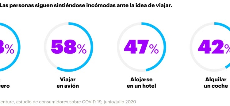 Y es que, según uno de los estudios de Accenture, pese a que los datos han mejorado con el paso de los meses, el 43% de los consumidores sigue siendo cauteloso a la hora de reanudar sus actividades normales. El 17% que afirma estar viviendo el momento y al 28% que está ansioso por volver a cómo eran las cosas antes. De igual manera, el 58% tiene miedo todavía a viajar en cruceros y en avión; el 48% también se muestra precavido a la hora de alojarse en un hotel, y el 42% a alquilar un coche. Además, el estudio espera que el uso de canales digitales aumente en más del 10% según se vaya aliviando la pandemia.