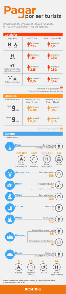 En el caso concreto de España, la Generalitat de Cataluña actualizó el pasado mes de abril la tasa turística, que distingue dos supuestos: si el turista se aloja en Barcelona o en cualquier otra parte de la Comunidad. La cuota en Barcelona va desde 2,25 euros por persona y día si el turista se aloja en un hotel de cinco estrellas o camping de lujo a 0,65 euros en aquellos establecimientos que no sean hoteles ni apartamentos turísticos. En el resto de Cataluña el impuesto oscila entre 9,45 y 2,25 euros.
