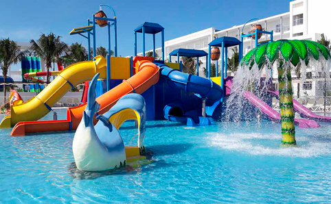 El hotel cuenta con cinco piscinas exteriores, dos de ellas con swim-up bar. Otro de los grandes atractivos es el parque acuático ‘Splash Water World’,y el club infantil RiuLand.
