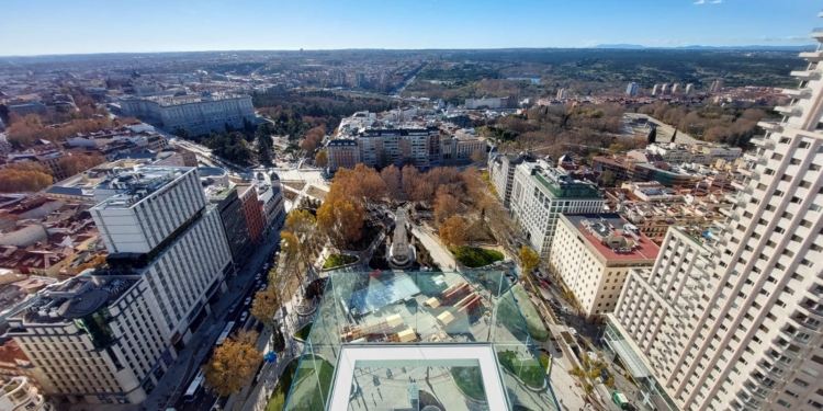 Hotel RIU de Madrid ha añadido un atractivo más a sus espectaculares vistas de la capital: un mirador transparente sobre la recién inaugurada Plaza de España. Este balcón de vidrio, solo apto para valientes, está suspendido a 100 metros de altura y ofrece una panorámica del sur de la capital, con unas perspectivas únicas de la Casa de Campo, el Palacio Real o el Templo de Debod.