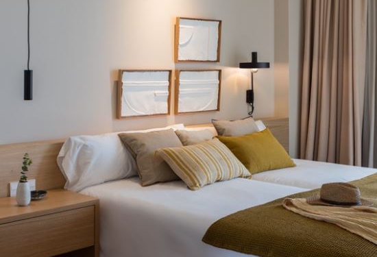 En las paredes de las habitaciones se han incorporado unos marcos de madera con un trabajo manual de papel de la mano de la empresa Museu Molí Paperer de Capellades. Preside el salón un gran cuadro de distintos niveles que aporta color a la estancia, el color de la laca brillante del cuadro varía dependiendo de la planta en la que te encuentras.
