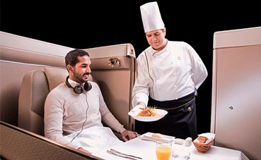 Además, la First Suite funciona como un espacio idóneo de trabajo gracias a la disponibilidad de una amplia mesa escritorio de 24 x 24,5 centímetros y servicio Wi-Fi dentro de la cabina. En las horas de comida, dicho escritorio se convierte en mesa-comedor para degustar un menú de cuatro platos preparado por un chef a bordo que fusiona cocina internacional y árabe.