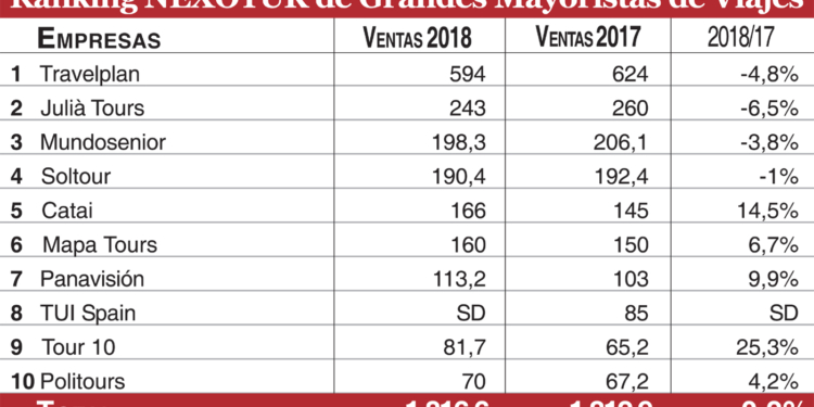 El negocio de los turoperadores punteros del mercado español se frena en seco. Según los datos recabados por NEXOTUR, la cifra de negocio de las nueve empresas líderes con sede en el país se sitúa en 1.816,6 millones de euros en el global del año, lo que supone un tímido avance interanual del 0,2%.