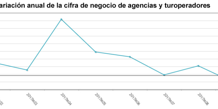 En los diez primeros meses de 2017 la facturación de minoristas y turoperadores experimenta un crecimiento interanual del 2,1%. Es justamente la mitad que en el global de 2016, cuando el volumen de negocio de estas empresas registró un aumento del 4,2%. Sorprendentemente, un año antes se creció el doble, con una tasa interanual del 8,4%.