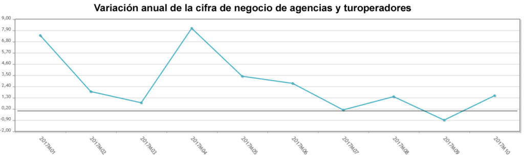 En los diez primeros meses de 2017 la facturación de minoristas y turoperadores experimenta un crecimiento interanual del 2,1%. Es justamente la mitad que en el global de 2016, cuando el volumen de negocio de estas empresas registró un aumento del 4,2%. Sorprendentemente, un año antes se creció el doble, con una tasa interanual del 8,4%.