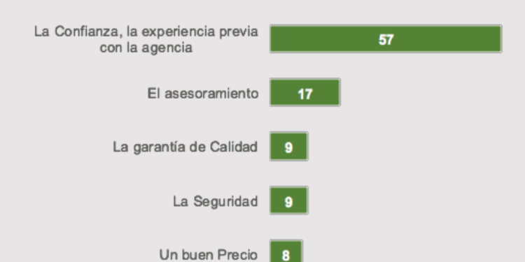 Desde la óptica de los profesionales del Sector, la confianza, basada en la experiencia previa, es el elemento más importante que lleva a un cliente a elegir una agencia de viajes. Así lo señala el 57% de los participantes en la encuesta. Muy por detrás están cuestiones como el asesoramiento, con un porcentaje del 17%, la garantía de calidad, la seguridad y un buen precio, con pesos del 9% en cada uno de los dos primeros y del 8% en el tercero.