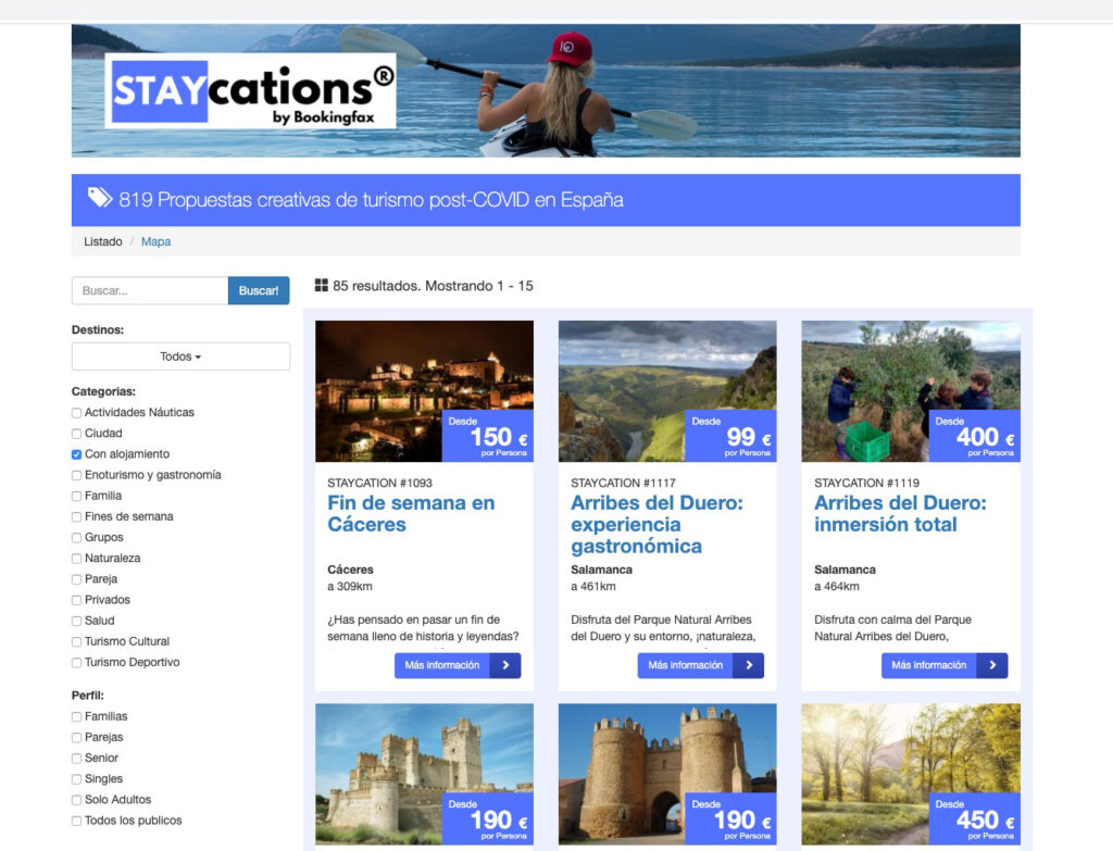 Staycation.es reúne cerca de 820 propuestas diferentes de actividades y experiencias destinos de todas las provincias que los viajeros pueden consultar y reservar a través de la web en la agencia de viajes más cercana en su ciudad. Los agentes de viaje se ocuparán de completar la reserva y podrán añadir otros servicios complementarios, como hoteles, restauración, transportes o atracciones.