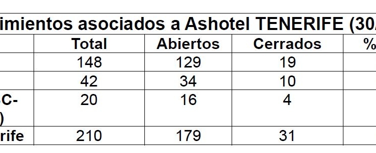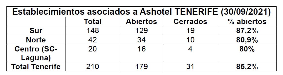 En cuanto al número absoluto de establecimientos alojativos de Tenerife, de los 210 asociados, 179 están abiertos a 30 de septiembre (el 85,2%). Por zonas, el sur de la isla tiene ya el 87,2% operativo, el norte el 80,9% y la zona metropolitana el 80%. Las previsiones realizadas a finales de agosto sobre las reaperturas de establecimientos asociados en septiembre han vuelto a superar las expectativas, dado que la volatilidad del mercado y la incertidumbre influye en que las decisiones empresariales se tomen más a corto plazo y sea más complicado planificar.