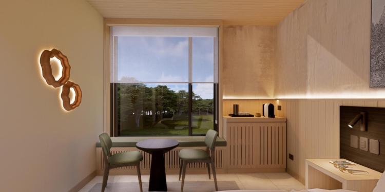 Las habitaciones incorporan amplios ventanales que ofrecen vistas panorámicas y llenan el espacio de luz natural, lo que establece una conexión armoniosa entre el interior y el exterior. Con tonos cálidos de madera y elementos terrosos, los interiores refuerzan el vínculo con el entorno local, creando un ambiente propicio para la relajación. Asimismo, cada habitación contará con artículos artesanales creados por artesanos de la región, añadiendo un toque distintivo que rinde homenaje a la cultura local.