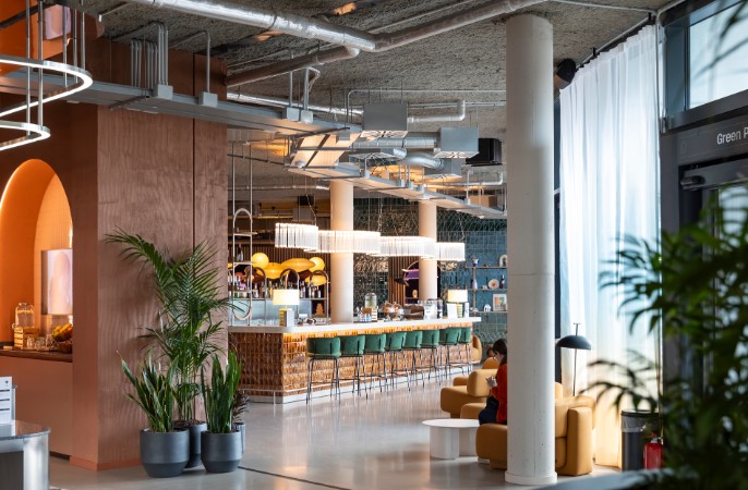 Partiendo del legado del lugar, The Social Hub ha diseñado tres edificios, todos ellos conectados por un parque público de 10.000 metros cuadrados con más de 300 árboles, que abrirá este verano. El primer edificio es un moderno hotel de cuatro estrellas con 396 habitaciones, que ofrece alojamiento de corta y de larga estancia para viajeros y estudiantes, incluyendo apartamentos de hasta dos dormitorios y un gimnasio totalmente equipado abierto las 24 horas.