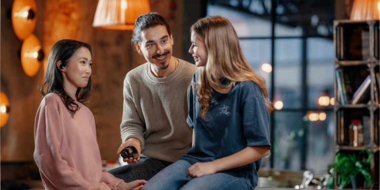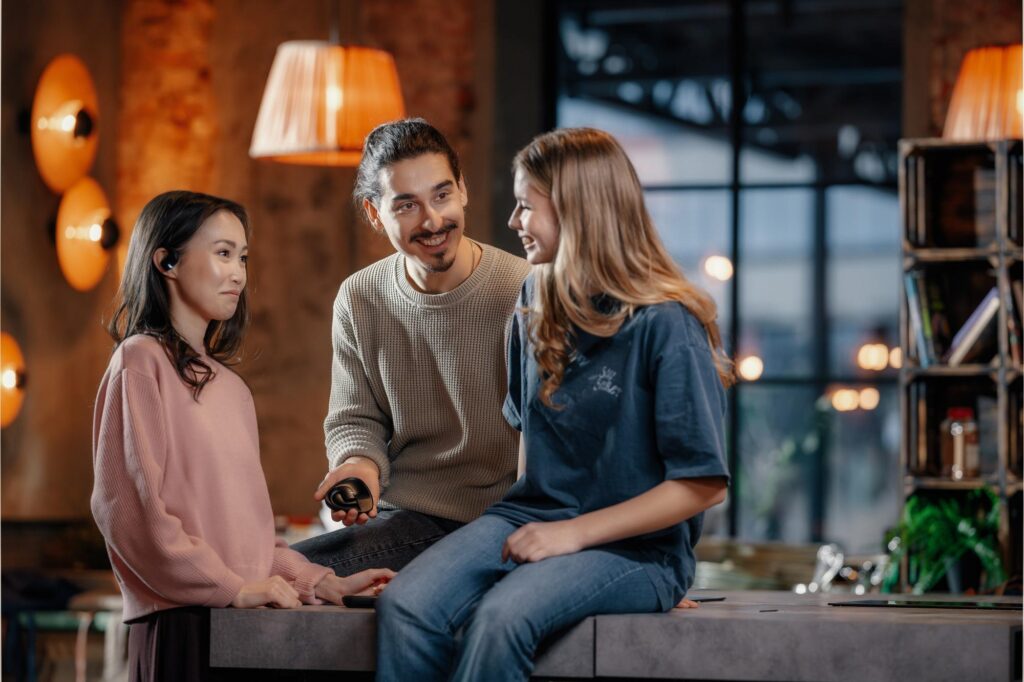 El Traductor E1 es perfecto para conversaciones en grupo y de negocios. Cada auricular puede configurarse en un idioma diferente y se detectan automáticamente durante la conversación antes de ser traducidos para los demás. De este modo, cada persona puede hablar en su propio idioma y entender lo que los otros están diciendo. La aplicación móvil VASCO Connect permite conectar hasta 10 auriculares en una sola conversación, mientras que el Traductor V4 permite conectar hasta seis auriculares.
