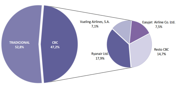 El mercado low cost, que sigue arrebatando cuota de mercado al convencional, está claramente dominado por tres compañías aéreas. Ryanair, Easyjet y Vueling concentran en este mes el 32,5% del flujo aéreo de pasajeros internacionales recibido en España, mientras que acaparan el 68,9% en esta modalidad aérea. Entre las tres suman 1,4 millones de usuarios.